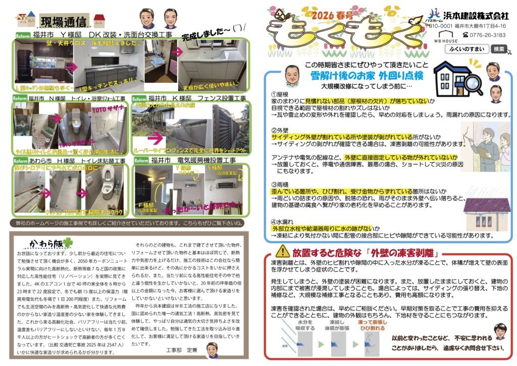 さて【もくもく春号】が発刊されます♪今年の冬は、厄介な雪のせいで屋根周辺(瓦や雨樋)の補修工事のご依頼が多いです。
