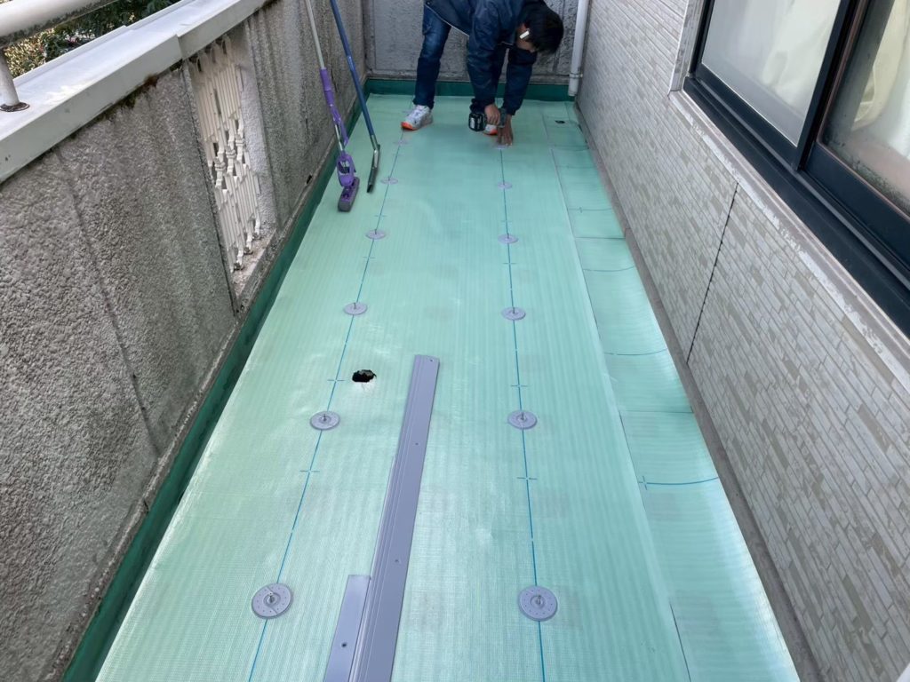 まず表面に敷いてある既存のコンクリートブロックを剥がし、全面に1.5㎜の塩ビシートを張りつけました。既存の素材の関係で、機械式固定方法という特殊な工法で施工させて頂きました。