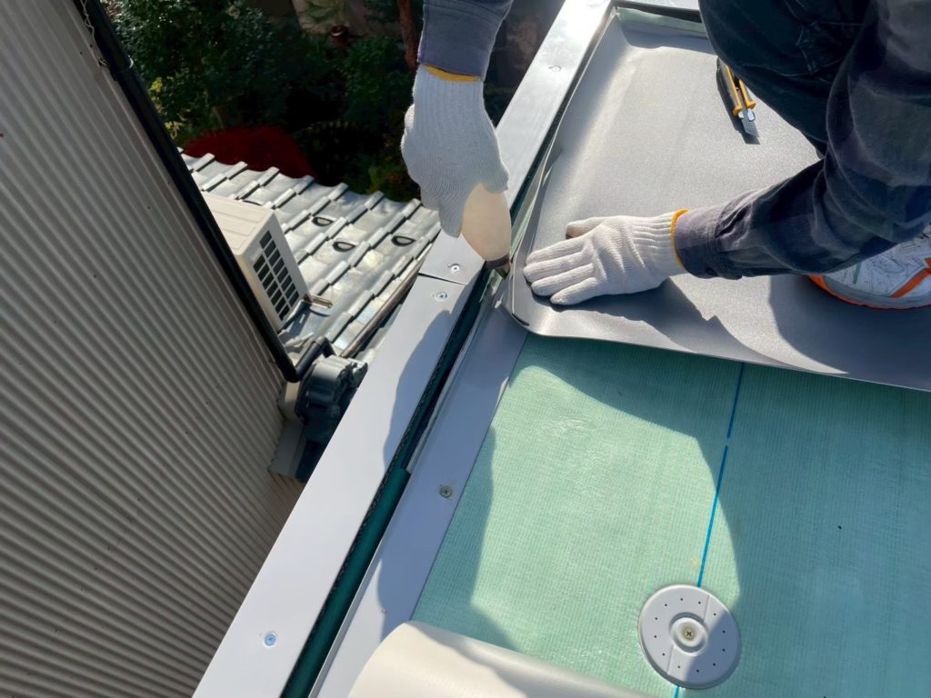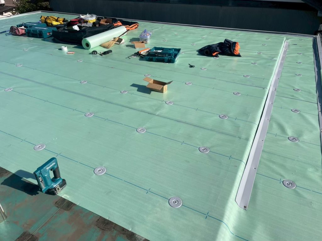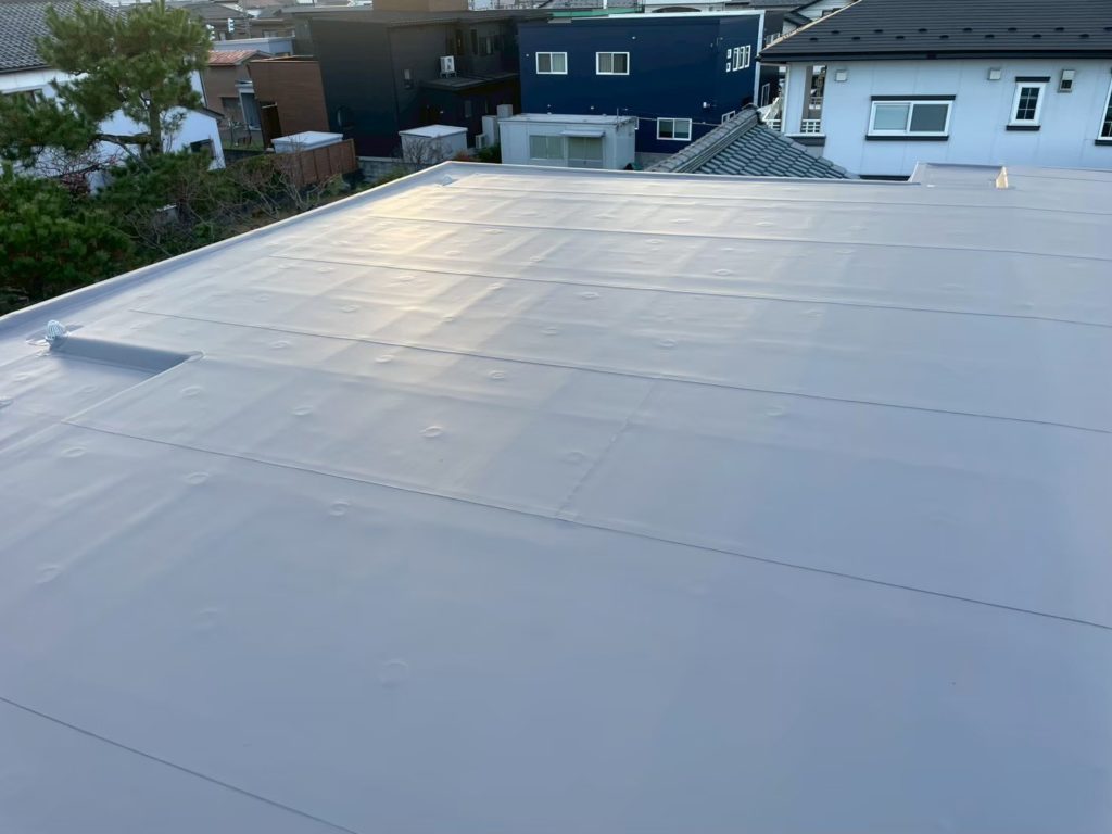 屋上フェンス等の不要なものは撤去し、軒先まで、きっちりと隙間が無いように防水シートで施工してあります。