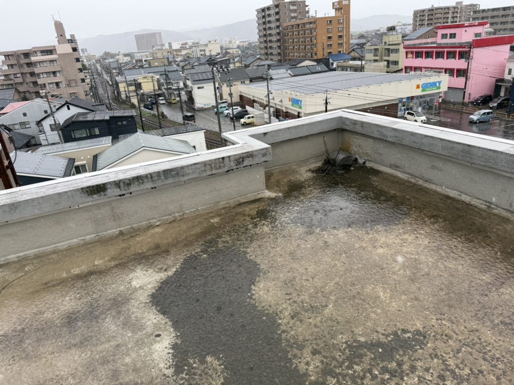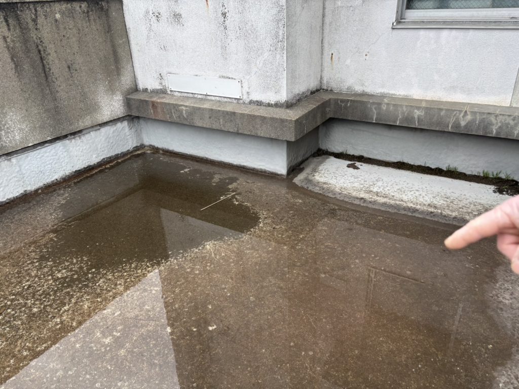 さて、会社近くのO様邸ですが、屋上の【防水の膨れ】(防水層の下に水分が入り込み、放置すると雨漏りに繋がる恐れがあります)や【雨漏りによる天井のシミ】があるとのことで、屋上の防水補修工事をさせて頂く事になりました。
