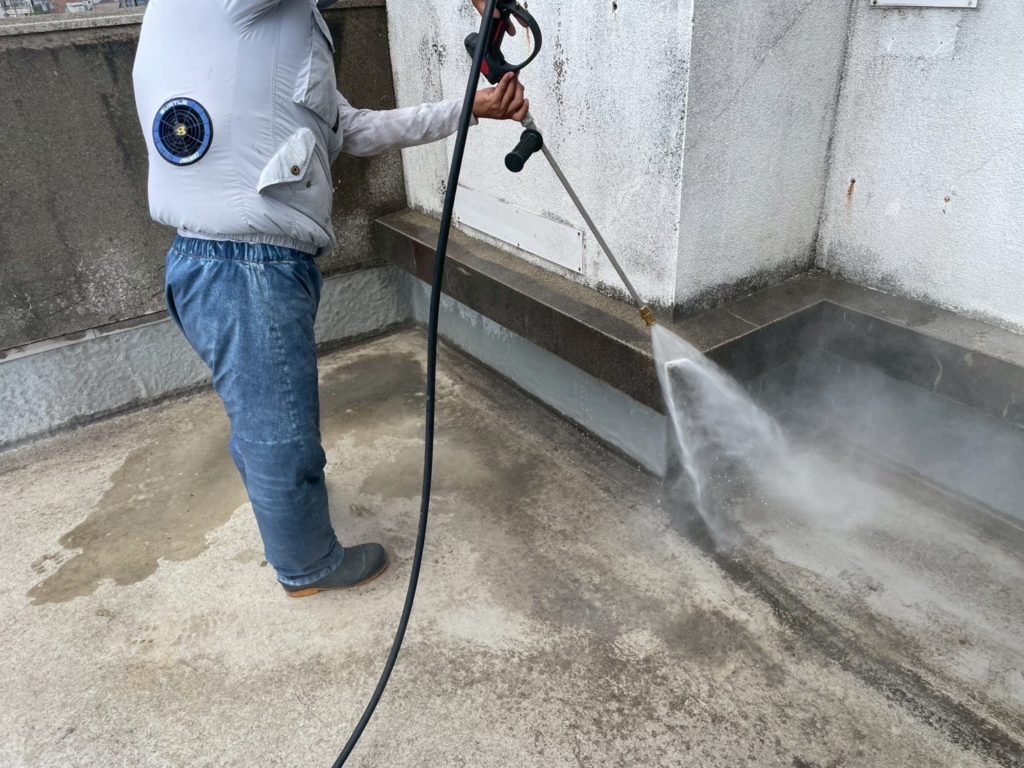 高圧洗浄の後、トップコートの痛み部分を補修し、プライマー塗布(下塗り)、脱脂(塗装や接着を行う前に、対象物の表面に付着した油分や汚れを取り除く重要な工程)して、トップコートを塗り直すという作業をさせて頂きました。